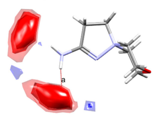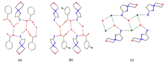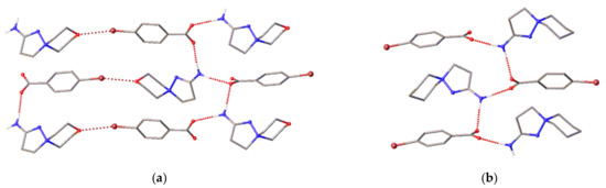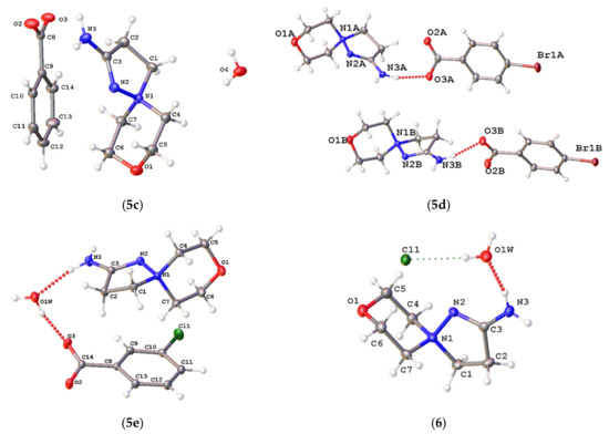 Crystal packing of a molecule can give valuable information about the most abundant intermolecular interactions of a polytopic molecule. The discussed cations can act as donors of two hydrogen bonds and, theoretically, acceptors of three H-bonds (through O(1), N(2) and N(3) atoms). However, the Full Interaction Maps tool [21,22] implemented within the Mercury 2020.1 package [23] undoubtedly indicates the “inertness” of this cation as an acceptor of H-bonds (Figure 3). A monocarboxylate can only be an acceptor of 2–4 H-bonds. Thus, in the absence of water molecules, the cations and anions form simple H-bonded chains (Figure 4) [9]. In 5d, these chains are further connected through halogen C-Br..O interactions (Figure 4a). In crystals of 5c, 5e, and 6, water molecules act as linkers between the anion and cation and additionally bind two chains through O-H...O(anion) or O-H...Cl− interactions (Figure 5) so that topologically identical H-bonded chains of the ladder-type are formed.