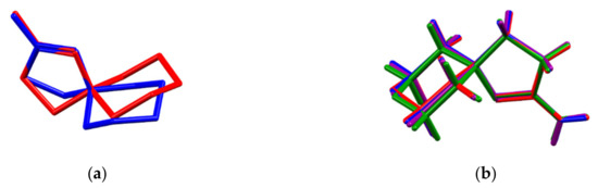 Molecular conformations of (a) two independent cations in 5d (blue and red; H atoms are omitted); (b) similar conformations of cations in 5c (red), 5d (blue), 5e (green) and 6 (magenta).