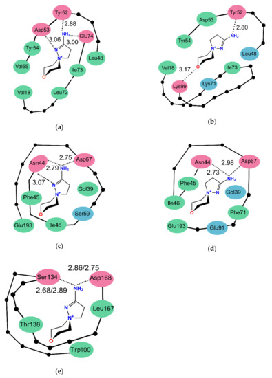 Schematic representation of the interactions between 2-amino-8-oxa-1,5-diazaspiro[4.5]dec-1-ene-5-ammonium and the residues within binding pockets of 1NBU (type A (a), type B (b)), 4XT4 (type A (c) and type B (d)), and 5ICJ (e). The colors of the residues indicate the character of bonding: pink correspond to H-bonds, green—hydrophobic interactions, blue—electrostatic interactions. H-bonds and their distances are depicted with dotted lines. Left—column corresponds to type A cations, and the right—to type B molecules.