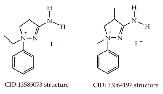 Information on pyrazolinium structures with a quaternary nitrogen atom is limited. Thus, two examples of biologically active pyrazolinium salts were found: 3-amino-1-ethyl-1-phenyl-4,5-dihydro-1H-pyrazolinium iodide (PubChemCID: 13585073 structure, [5]) and 3-amino-1,4-dimethyl-1-phenyl-2-pyrazolinium iodide (PubChemCID: 13064197 structure, [6]) (Scheme 1):
