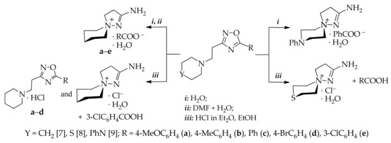 Further in this work, we investigated the conditions for the Boulton–Katritsky rearrangement of 5-substituted phenyl-3-[2-(morpholin-1-yl)ethyl]-1,2,4-oxadiazoles (4a–e) under the deliberate establishment of hydrolysis conditions: (i) DMF with the two equivalent amount of water when heated to 60–70 °C; (ii) alcohol/ethereal HCl mixture in the presence of air moisture (Scheme 5).