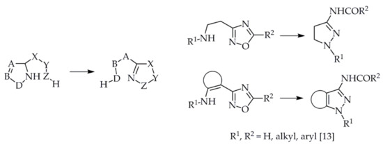 These facts are consistent with the known for 3,5-substituted 1,2,4-oxadiazoles with a saturated side chain spontaneous thermally induced monomolecular Boulton–Katritzky rearrangement and provided the first examples of spirocompound formation through such reaction. In general, a variety of Boulton–Katritzky rearrangements could be represented as the following scheme (Scheme 3) [10,11]: