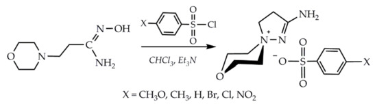- Kayukova, L.A.; Praliyev, K.D.; Myrzabek, A.B.; Kainarbayeva, Z.N. Arylsulfochlorination of β-aminopropioamidoximes giving 2-aminospiropyrazolylammonium arylsulfonates. Rus. Chem. Bull. 2020, 69, 496–503. [Google Scholar] [CrossRef]
