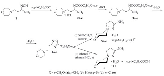 - Kayukova, L.A.; Orazbaeva, M.A.; Gapparova, G.I.; Beketov, K.M.; Espenbetov, A.A.; Faskhutdinov, M.F.; Tashkhodjaev, B.T. Rapid acid hydrolysis of 5-aryl-3-(β-thiomorpholinoethyl)-1,2,4-oxadiazoles. Chem. Heterocycl. Compd. 2010, 46, 879–886. [Google Scholar] [CrossRef]