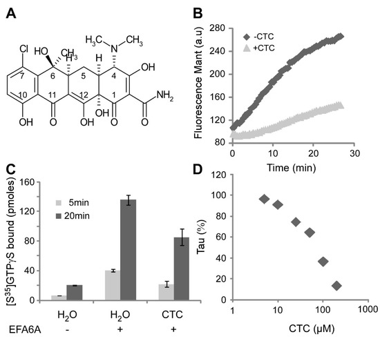 To search for molecules that inhibit Arf6, we developed a high throughput ad hoc in vitro assay based on Arf6 activation stimulated by EFA6A. The guanine nucleotide exchange of the full-length Arf6 was carried out in the presence of liposomes to faithfully mimic the in vivo enzymatic reaction, which includes the toggle of the N-terminal amphiphatic helix and its binding to the lipid membrane during GTP binding-induced conformational change. The nucleotide exchange reaction was followed by fluorescence resonance energy transfer (FRET) between an Arf6 tryptophan and the fluorescent mant (2’/3’-O-(N-Methyl-anthraniloyl)-labelled GTP (mant-GTP) bound to Arf6. In total, 1120 FDA-approved compounds from the Prestwick library were screened at a concentration of 100 µM. Six molecules inhibited the EFA6A stimulated activation of Arf6. We focused our study on a cell-permeant compound, chlortetracyclin (CTC), which was the most effective among several molecules of the same family (Figure 1A,B).