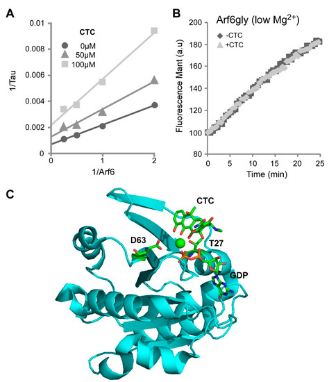 Tetracycline derivatives have been shown to bind magnesium ions with a ~3 mM affinity [19]. Interestingly, Mg2+ is present in the guanine nucleotide site of G proteins where it plays a crucial role in the binding of the nucleotide. Therefore, we asked whether magnesium is required for the binding of CTC to Arf6 and for its inhibition effect. At low magnesium concentration (~1 µM free Mg2+), a condition in which the nucleotide exchange is favored, we observed that the drug had no effect on Arf6 activation (Figure 3B). This result suggested that CTC inhibitory activity required the presence of a magnesium ion.