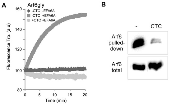 In order for the drug to be useable in vivo, it needs not only to block the nucleotide exchange but foremost to prevent the conformational change that comes along. To verify that CTC inhibits the conformational activated state of Arf6, that is the switch toggle that exposes the effector binding domain, we performed two additional assays. First, we measured the change of the intrinsic fluorescent of tryptophan residues in Arf6 that reflects the conformational change occurring upon GTP binding. In the presence of EFA6A, CTC effectively prevented the fluorescence increase (Figure 4A). Second, we performed a pull-down experiment with the purified Arf-binding domain of the Arf effector GGA3. In the presence of GTP and absence of CTC (control condition), Arf6 was efficiently pulled-down by GST-GGA3. In contrast, the addition of CTC totally abolished the binding of Arf6 to its effector domain (Figure 4B). These results clearly indicate that CTC inhibits the conversion of Arf6 towards its active state and consequently its capability to bind its effectors.