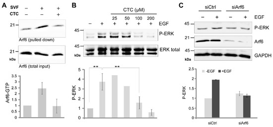 EGF was reported to stimulate the Arf6-dependent activation of the MAPK cascade [22]. Addition of EGF (50 ng/mL) to serum-starved RPE-1 cells triggers the phosphorylation of ERK, which is inhibited in a dose-dependent manner by CTC (Figure 5B), similarly to siRNA-mediated depletion of Arf6 (Figure 5C). Thus, CTC can inhibit Arf6 activation and an Arf6-associated signaling pathway in RPE-1 cells.