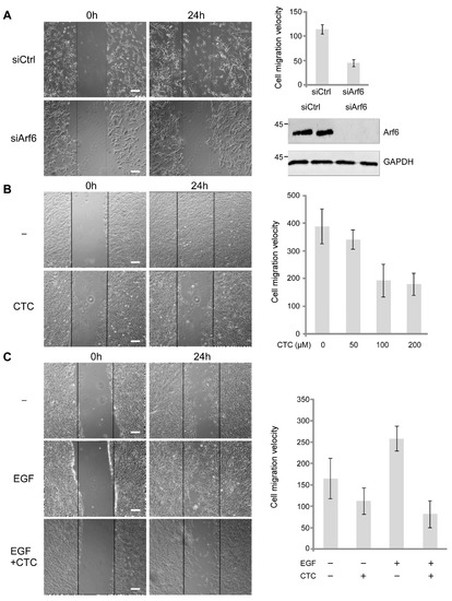 Arf6 participates in the regulation of the motility of various cell lines [19,20,21]. Using a wound-healing assay, we examined the impact of CTC on the migratory properties of RPE-1 cells. We first determined that the migration of RPE-1 cells was Arf6-dependent in the presence of serum. Indeed, we observed a two-fold reduction of the migration rate of RPE-1 cells upon Arf6 depletion (Figure 6A).