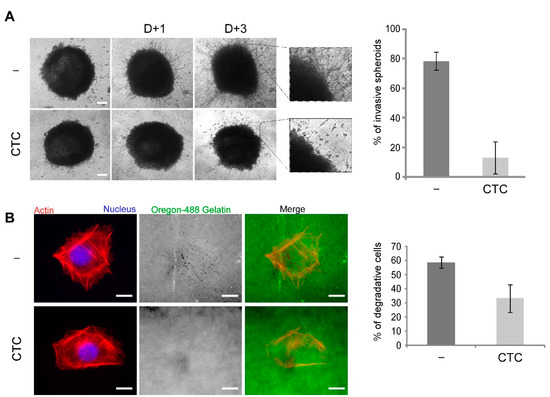 CTC inhibits MDA-MB-231 cell invasion and matrix degradation properties. (A) Spheroid formation of MDA-MB-231 cells in collagen was monitored for 3 days with or without CTC (100 µM). The graph (right panel) represents the % of invasive spheroids estimated after 3 days (n = 100 per experiment) compared to t = 0 from 3 independent experiments performed in quadruplicates. The mean is represented ± SD. Scale bar 100 µm. (B) Representative images of MDA-MB-231 placed in Oregon-488 gelatin (green) coated coverslips and stained for F-actin (red) and nuclei (blue). Areas devoid of fluorescent signal indicate degradation of the fluorescent gelatin. Scale bars 10 μm. Quantification of degrading cells (right panel). Values are percentages of degrading cells, in which 100 cells per condition were analyzed. n = 3, Student’s t-test, * p < 0.05.