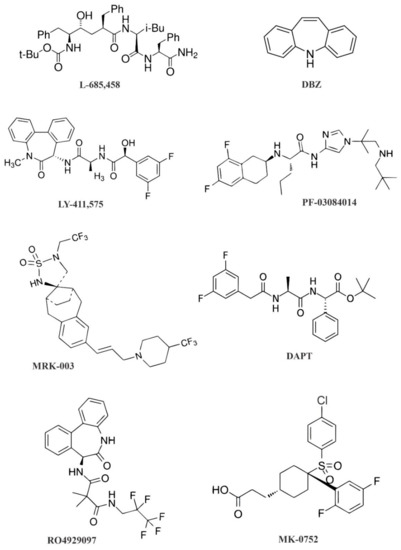 Depending on the chemical structure and binding sites, GSIs can be divided into two large classes, namely peptide inhibitors and non-peptide inhibitors. Peptide inhibitors are divided into five sub-classes, namely peptide aldehyde derivatives, difluoroketone derivatives, hydroxyethylene dipeptide isostere derivatives, α-helical peptide derivatives, and dipeptide analogues. Non-peptide inhibitors represent two sub-classes, namely benzodiazepines derivatives and sulfonamides derivatives [22].