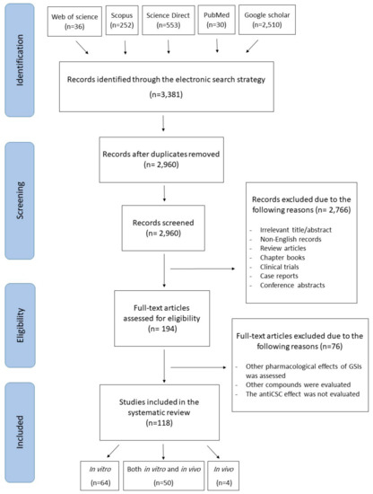 The current systematic review was conducted following the Preferred Reporting Items for Systematic Reviews and Meta-Analysis (PRISMA) guidelines [32]. The objective of this review is to provide a systematic review of in vitro and in vivo studies for investigating the impact of GSIs on cancer stem cells. Various electronic scholarly databases, including Scopus, PubMed, Science Direct, Google Scholar, and Web of Science, were searched and relevant studies in English language were collected up to February 2020. The search syntax included “cancer stem cell” OR “tumor stem cell” OR “initiating tumor cell” OR “neoplastic stem cell” OR “colony forming unit” AND “gamma-secretase inhibitor” OR “γ-secretase inhibitor”. The primary search was conducted by two researchers separately, and unrelated studies were excluded based upon their titles and abstracts. Review articles, meta-analyses, books, book chapters, conference abstracts, case reports, clinical trials, and non-English articles were also excluded. An overview of the literature search and selection process is presented in Figure 3.