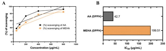 DPPH free radical scavenging activity of MEHA compared with the reference standard ascorbic acid (AA). (A) Percentage of DPPH free radical scavenging activity by different concentrations of the MEHA and reference standard AA. (B) IC50 values for DPPH free radical scavenging activity of MEHA and AA. Values are expressed as mean ± SEM of three independent experiments. MEHA refers to methanol extract of Homalomena aromatica leaves. DPPH: 1,1-diphenyl-2-picrylhydrazyl radical.