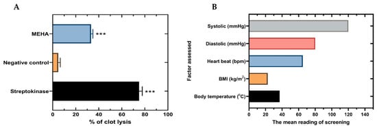 (A) The clot lysis activity of MEHA, streptokinase (SK) and distilled water (negative control). (B) The healthy volunteer status presented. Results are expressed as mean ± SEM of three independent experiments. *** p < 0.001, significantly different from control; ANOVA followed by Dunnett’s test. MEHA: Methanol extract of Homalomena aromatica leaves.