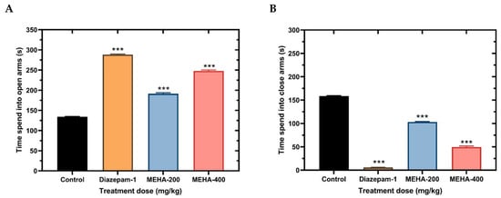 Amongst many significant animal experiments, elevated plus maze (EPM) is one of the most important behavioral assays for the assessment of anxiolytic-like effects. The sensitivity of this test to the effect of anti-anxiety and anxiogenic drugs acting to the GABA benzodiazepine complex is very high [35]. The EPM apparatus has two opposite open and two closed arms, where regular mice normally spend much of their allowed time in the closed arms. This type of behavior reflects a distaste for open arms created by the anxiety caused by open spaces. Drug-like anxiolytics that enhance the exploration of open arms are believed to have anxiolytic activity. Administration of extract significantly increased the time spent in open arms compared to the control (Figure 3). As shown in the Figure 3A, MEHA at the dose of 200 mg/kg and 400 mg/kg significantly enhanced the time spent (p < 0.001) in the open arms (191.33 ± 2.43 and 248 ± 2.08 s, respectively) indicating anxiolytic effects. Understandably, the time spent in the closed arms of extract treated mice were less (Figure 3B).