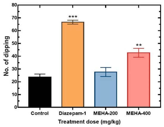 Likewise, the hole board experiment used to show the anxiolytic effect of the extract. After treatment, the head dipping number was increased efficiently in case of diazepam as well as extract administered animals compared to the control. The MEHA at both dose levels showed an increase in the number of head dipping events whereas 400 mg/kg produced a significant upsurge (42.67 ± 3.48) as compared to the control animals (p < 0.01) (Figure 4).