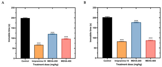 Antidepressant activity of MEHA on tail suspension (A) and forced swimming (B) tests in mice. Results are expressed in mean ± SEM. *** p < 0.001, significantly different from control; ANOVA followed by Dunnett’s test (n = 3, per group). MEHA: methanol extract of Homalomena aromatica leaves; MEHA-200, methanol extract of H. aromatica 200 mg/kg; MEHA-400, methanol extract of H. aromatica 400 mg/kg; Reference drug imipramine hydrochloride (10 mg/kg).