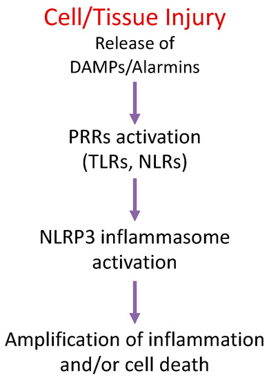 Schematic representation of the critical steps that lead from cellular injury to the inflammatory response. DAMPs, damage associated molecular patterns; PRRs, pattern recognition receptors; TLRs, Toll-like receptors; NLRs, Nod-like receptors; NLRP3, NACHT, leucine-rich repeat (LRR), and pyrin domain (PYD)-containing protein 3.