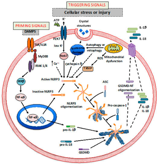 Several trigger signals have been identified for NLRP3 [9]. These signals are unrelated and include intracellular signals (e.g., lysosome rupture, mitochondrial dysfunction, and reactive oxygen species) and extracellular signals (e.g., ATP-mediated activation of the purinergic-type 2 receptor X7, P2X7, potassium efflux, and calcium influx).