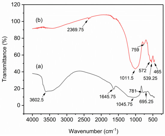 The FTIR spectrums of VPum (Figure 2a) and VSco (Figure 2b) at wavelengths ranging from 4000 to 400 cm−1 are shown in Figure 2. Due to the symmetric stretching vibration of Si-O-Si, the absorption band at 1045.75 cm−1 can be assigned to the characteristic peak of (SiO4)2− groups in the FTIR spectrum of VPum [39], whereas the band located at 1011.5 in the FTIR spectrum of VSco can be belongs to the asymmetric stretching vibration of T-O-Si, T = Si or Al [40]. In the FTIR spectrum of VPum, the peaks at781 and 695.25 belong to bending vibrations of Si-O-Si bond [38], whereas the band shown in the FTIR spectrum of VSco at 759 is related to the stretching vibration of 6-fold coordinated Al(VI)-OH and 6-fold coordinated Al(VI)-O [41]. The small peaks shown in the FTIR spectrum of VSco at 572 and 539.25 can be attributed to the symmetric stretching of Si-O-Si and Al-O-Si [40,42], whereas the small band at 465 belongs to bending vibrations of Si-O-Si and O-Si-O [42]. Certain peaks like the broadening peak at 3602.5 cm−1 in the FTIR spectrum of VPum and sharper peak at 2369.75 cm−1 in the FTIR spectrum of VSco belongs to the asymmetric stretching vibration of -OH bond can be allocated to adsorbed water molecules, whereas the peak at 1645.75 cm−1 in VPum can be allocated to the bending vibration of H-O-H bond [38,39,42]. The most characteristic difference observed between the FTIR spectrum of VPum and FTIR spectra of VSco concerning the band attributed to the asymmetric stretching vibration of -OH bond. This band that is appeared as a broad band at about 3602.5 cm−1 in the FTIR spectrum of VPum becomes sharper and shifts to lower frequencies (2369.75 cm−1) in the FTIR spectrum of VSco indicating that there is a high water content in VPum and could be correlated with less mechanical strength than VSco. Similar observations have been reported for a different system [42].