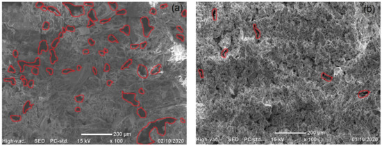 The VPum (Figure 3a) and VSco (Figure 3b) SEM micrographs allowed direct observation of the surface morphology of the adsorbents with a magnification of ×100. The structure of VPum showed that the surface of VPum had an interconnected porous surface [38,43], while VSco had an irregular shape and fibrous cavities (or pores). In addition, it may be said that these pores in VSco were either closed or in open forms (pores) [44]. As seen from the micrographs of the adsorbents, VPum had an interconnected inner porous surface (as indicated in Figure 3a, red-colored), while VSco (Figure 3b) is dominated by the dead-end pores. Consequently, the interconnected internal pore structure in VPum allows for better fluoride accessibility and, hence, better adsorption capacity than VSco.