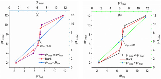 The pH of the rock samples in water was found to be 6.65 and 7.20 for VPum and VSco, respectively. The point of zero charges (pHPZC) of the adsorbents was identified as 6.85 for VPum and 6.98 for VSco at the intersection of the graph of the initial pH vs. the final pH (Figure 4). The slight difference observed in the adsorbents pHpzc is related to their different characteristics. As can be seen from Table S1, the two volcanic rocks (VPum and VSco) have different chemical compositions, which also influence the surface charge of the adsorbents. This is in agreement with previous studies [30,45], showing the effect of chemical composition on the zeta-potential of different materials. Below these values (pH < 6.85 for VPum and <6.98 for VSco), the surface of the adsorbents is positively charged. Thus, if the pH < pHPZC, fluoride could possibly be adsorbed onto the surface of the adsorbents by coulombic attraction [6,46,47]. In addition, the curve for the blank experiment (for blank electrolyte solution 0.01 M NaCl) of both adsorbents is shown in Figure 4. As seen from the blank curve (Figure 4), a pH change without adding the adsorbents was obtained, which confirmed the sorbent dosing is not the only factor to fluctuate the pH of the solution.