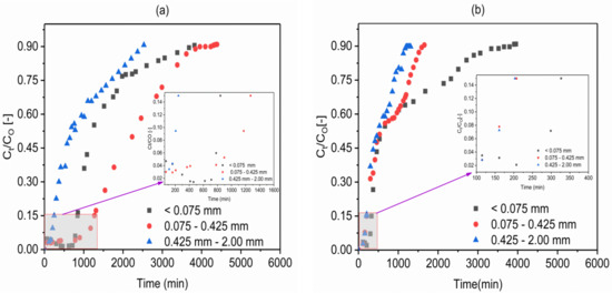 Effect of particle sizes on the breakthrough behavior of fluoride in (a) VPum and (b) VSco at (pH 2.00; influent fluoride concentration 10 mg/L (CO: 10 mg/L); flow rate 1.25 mL/min (QO: 1.25 mL/min; bed depth 10 cm).