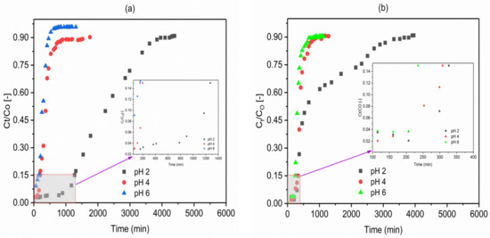 The influent solution’s pH can noticeably affect the anions sorption on the adsorbents by changing the degree of ionization, the ion speciation, and the adsorbent’s surface charge. Therefore, the effect of solution pH on adsorption of fluoride using VPum and VSco was investigated at different pH (2.00, 4.00, and 6.00) by a separate set of fixed-bed adsorption columns. The breakthrough curves obtained for both adsorbents are shown in Figure 6a,b for a fixed inlet flow rate of 1.25 mL/min, influent fluoride concentration of 10 mg/L, column bed depth of 10 cm, and a particle size of <0.075 mm for VSco and 0.075–0.425 mm for VPum.