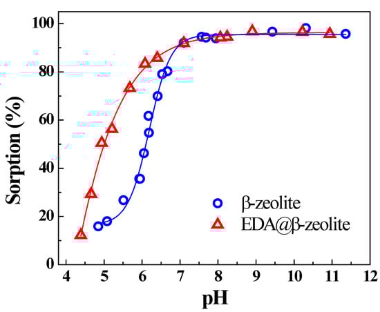 The effect of pH on Cu(II) removal by β-zeolite and EDA@β-zeolite is shown in Figure 1; the results show that Cu(II) removal is strongly dependent on pH. At pH < 7.0, the removal of Cu(II) onto both β-zeolite and EDA@β-zeolite increased with pH increasing, the removal percentage by EDA@β-zeolite was obviously higher than that by β-zeolite under the same condition. The experimental phenomenon of the prepared materials is similar to many other results of metal ions adsorption from references [16,17,18]. It was conceivable that an excess of positively charged hydrogen ions existed in system at low pH, which caused that the competition between both positively charged Cu(II) and hydrogen ions for the available sorption sites on β-zeolite and EDA@β-zeolite surface. As pH increased, the competition between Cu(II) and hydrogen ions decreased, the electrostatic repulsion between Cu(II) and adsorbents surface decreased as well, which resulted in the sharp rise of Cu(II) removal in the pH range of 4.0–7.0 [16,19,20,21]. When pH above 7.0, the removal of Cu(II) reached maximum plateau and changed inconspicuously.