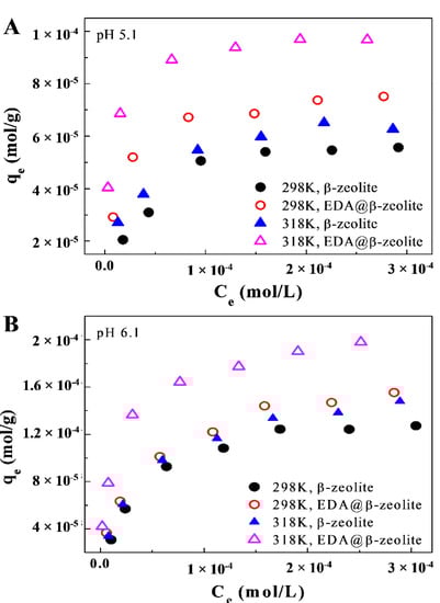 The adsorption isotherms of Cu(II) on β-zeolite and EDA@β-zeolite at different temperatures were shown in Figure 3. The removal of Cu(II) was strongly dependent on temperature, high temperature was favorable for Cu(II) removal. The thermodynamic parameters (ΔH0, ΔS0, and ΔG0) can be calculated from these temperature-dependent adsorption isotherms. The Gibbs free energy change (ΔG0) can be calculated from: