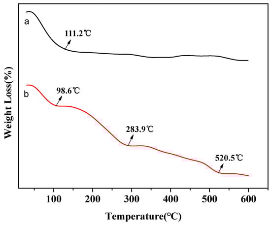 Figure 5a shows the thermogravimetric curve of β-zeolite. The primary weight loss can be observed at about 110 °C, which is attributed to the desorption of water molecules. While three weight loss temperature can be observed at 100, 280, and 520 °C from Figure 5b, the additional weight loss temperatures correspond to the volatilization and degradation of EDA. The results showed that EDA was successfully combined with β-zeolite after the modification process [15].
