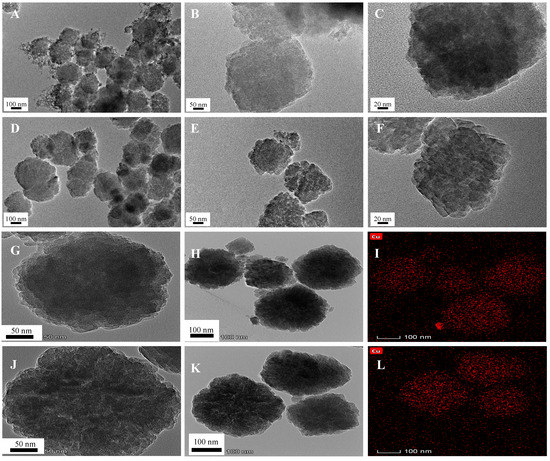 (A–C) TEM images of β-zeolite; (D–F) TEM images of EDA@β-zeolite; (G,H) TEM images of Cu(II)-loaded β-zeolite, pH = 6.10; (I) EDX Mapping of Cu(II)-loaded β-zeolite, pH = 6.10; (J,K) TEM images of Cu(II)-loaded EDA@β-zeolite, pH = 6.10; (L) EDX Mapping of Cu(II)-loaded EDA@β-zeolite, pH = 6.10.