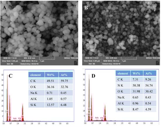 In order to examine the morphology of β-zeolite and EDA@β-zeolite, SEM is used to provide information on the morphological change before and after modification, meanwhile, the SEM coupled with energy dispersive X-ray spectroscopy (EDS) was used to assess the element distribution. The SEM images of β-zeolite and EDA@β-zeolite showed in Figure 7A,B. It can be clearly seen that β-zeolite and EDA@β-zeolite were aggregated spherical shape and diameter of particles that are in the range of about 0.3–0.5 μm. EDS spectra at single regions of β-zeolite and EDA@β-zeolite indicated the relative proportion of the different atoms, the results presented in Figure 7C,D, respectively. It is worth noting that the N mass percentage of β-zeolite and EDA@β-zeolite was about 0 and 54.74%, respectively. This result confirms the modification of EDA successfully.