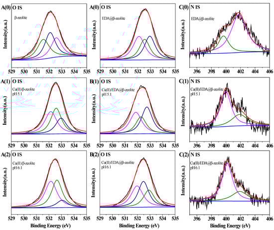 O 1s spectra of β-zeolite before Cu(II) adsorption [A(0)] and after Cu(II) adsorption [A(1),A(2)]. O 1s and N 1s spectra of EDA@β-zeolite before Cu(II) adsorption [B(0),C(0)] and after Cu(II) adsorption [B(1), C(1), B(2), and C(2)]. For A(1), B(1), and C(1), pH = 5.10; for A(2), B(2), and C(2), pH = 6.10.