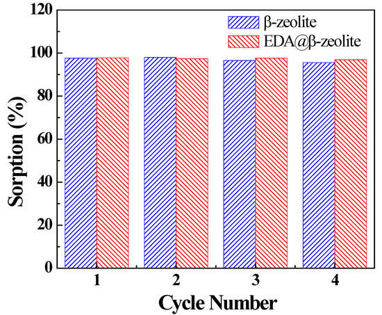 The reusability of a sorbent is essential to evaluate its performance and application basing on the economic consideration. As the results presented in pH effect part, few Cu(II) was adsorbed at very low pH, implying that acid treatment was a possible regeneration method for the Cu(II)-loaded adsorbents. The regeneration of β-zeolite and EDA@β-zeolite was performed in 0.05 mol/L HCl solution. As shown in Figure 10, after four cycles of the adsorption and desorption process, no significant decrease in Cu(II) adsorption was observed, the removal capacity for Cu(II) was more than 95%. The results indicated that the Cu(II)-loaded EDA@β-zeolite composite could be efficiently regenerated by 0.05 mol/L HCl and reused without obvious decrease in Cu(II) removal capability. The proposed EDA@β-zeolite composite in present work possesses potential long-term use with low replacement cost, and is a promising candidate for the industrial removal of Cu(II) from considerable volume of aqueous solution.