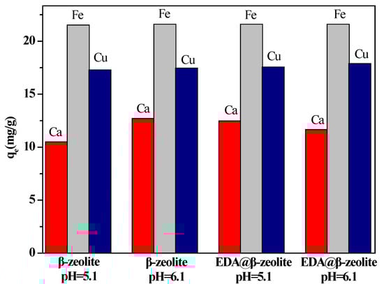 For industrial application, the effect of the presence of Fe(III) and Ca(II) on the performance in Cu(II) removal is studied. Figure 11 illustrates the competitive adsorption of Cu(II) onto β-zeolite and EDA@β-zeolite in mixed multi-metal solution. As shown in Figure 11, adsorption capacity follows such trend: Fe(III) > Cu(II) > Ca(II). It means that if Fe(III) is present in a real solution, β-zeolite and EDA@β-zeolite will also absorb Fe(III).