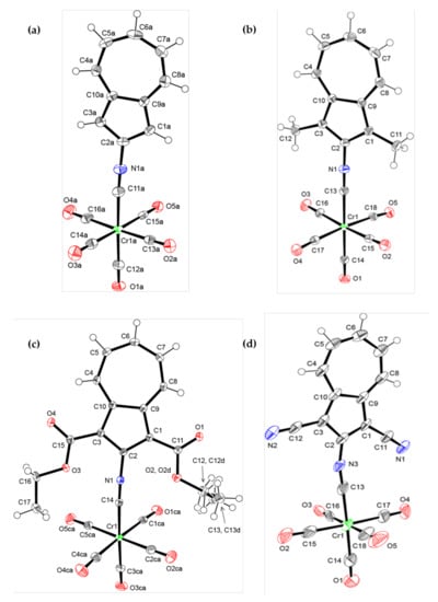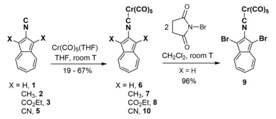 2.2. Preparation of Complexes [(OC)5Cr(2-Isocyano-1,3-X2-Azulene)], X = H, CH3, CO2Et, Br, and CN