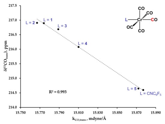 - Karakaş, D.; Kaya, C. Force constant calculations for octahedral complexes of the type M(CO)5L, based on the CO-factored force field. J. Organomet. Chem. 2001, 640, 37–40. [Google Scholar] [CrossRef]