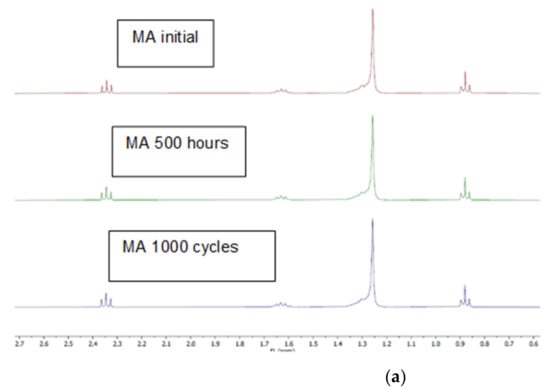 The analysis of the 13C and 1H spectra of initial samples, samples treated during 500 h at 60 °C and samples with 1000 thermal cycles for capric acid and myristic acids does not reveal significant differences between them. As can be seen in Figure 2, the 1H spectra for the myristic acid samples analysed have the same profile, and a similar result was obtained for capric acid samples; meaning that samples have the same composition within the detection limits of this technique. The thermo-oxidative processes involve radical reactions that may lead to chain scission and further ramification of the chains. Depending on the amount of ramifications produced it is expected a differentiate signal for the tertiary carbons in a 13C spectrum. However, the analysis of initial and treated samples does not show significant differences, as can be seen in Figure 2 in the example for capric acid samples. Similar results were obtained for myristic acid samples, revealing that if ramification took place, its extension is below the detection of limit of NMR 13C, estimated around 5%.