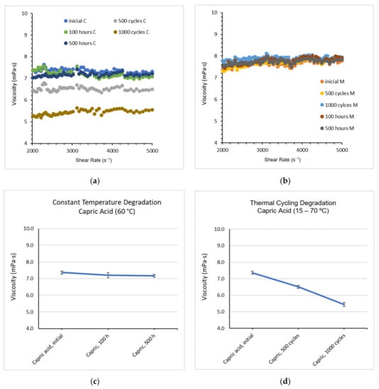 Capric acid presents an initial viscosity of 7.36 mPa·s (35 °C). Figure 4c shows that despite the presence of a degradation product of higher molecular weight, the thermal degradation at constant temperature does not noticeably change the capric acid viscosity, with minimal variation thought test time. However, the thermal cycled samples showed a significant change in the final viscosity of a 35% at 1000 cycles, as can see in Figure 4d. This change can be directly associated with the degradation of the material, forming other components of shorter structure that facilitate the fluidity of the material.