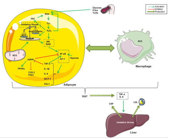 Graphical summary of some inflammatory and oxidative pathways related to obesity. High glucose intake and FFA-dependent TLR4 activation lead to the activation of NOX, which can also be activated by PKC in adipocytes. NOX mediates intracellular ROS generation, mainly O2•−, both in preadipocytes and macrophages. Likewise, mitochondrial ROS exacerbate oxidative stress and inflammatory processes in obesity. JNK mediates ROS and oxidative stress-dependent activation of NF-κB and AP-1. These latters regulate gene expression of TNF-α, IL-6, MCP-1 and PAI-1. The NF‑κB pathway might be upregulated in hypoxic adipose tissue and in response to TNF-α. Furthermore, TNF-α inhibits AMPK pathways, resulting in increased COX-2 and PGE2 and decreased PPARγ. TNF-α and IL-6 secreted from WAT enhance CRP and low-density lipoprotein (LDL) release from the liver in response to hepatic oxidative stress. A crosstalk between adipocytes and resident macrophages reinforces oxidative stress through TNF-α–mediated ROS generation within WAT cells in an autocrine and paracrine manner.