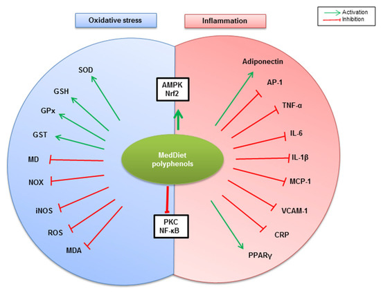 Summary of potential mechanisms by which MedDiet polyphenols modulate oxidative stress and inflammation associated with obesity. MedDiet polyphenols potentiate both AMPK- and Nrf2-mediated anti-inflammatory and antioxidant pathways, reflected by anti-inflammatory adiponectin, PPARγ, and endogenous antioxidants (SOD, GSH, GPx, and GST) upregulation. On the other hand, PKC and NF-κB-dependent inflammation and oxidative stress are counteracted by MedDiet polyphenols, reflected by the downregulation of pro-inflammatory molecules (AP-1, TNF-α, IL-6, IL-1β, MCP-1, VCAM-1, and CRP), and oxidative stress mediators and operators (MD, NOX, iNOS, ROS, MDA).