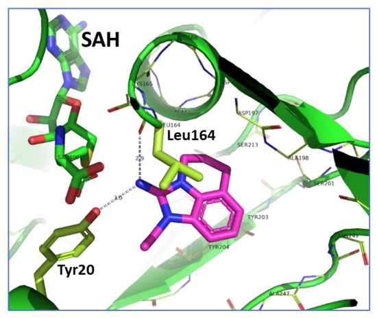 As is shown in Figure 4b, inhibitor (2) binds in the binding pocket for the substrate nicotinamide [25]. The imine residue of inhibitor (2) is near the position of the pyridine nitrogen of nicotinamide, the nitrogen of which accepts a methyl group during normal catalytic turnover of the enzyme. The carboxamide group of nicotinamide interacts with the side chains of Asp197 and Ser213. Around this position, inhibitor (2) only has aliphatic and aromatic carbons.