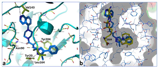 As shown in Figure 10a, the binding mode in the SAH pocket of the part that is common between (33) and (1) is identical. The position of (2) (Figure 10b) is slightly shifted with respect to the position of the tricyclic in (33), but also here the positions are very similar, showing that the fusion between the two inhibitor classes was successful.