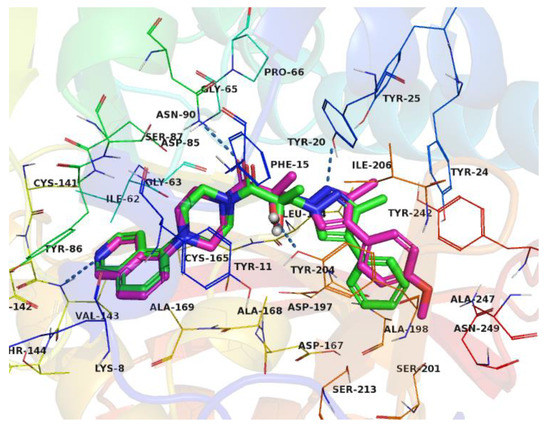 Predicted binding mode of compound 12 (magenta), along with the crystal structure of compound 1 (green), co-crystalized in hNNMT. The blue dashes are the polar interactions of compound 12 with the binding site amino acids. The figure was made using PyMOL v0.99.