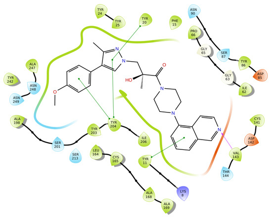 Based on the crystal structure of hNNMT, co-crystallized with (1), we predicted the binding mode of (12) using the Glide docking module of the Schrodinger 2016-2 release [26] to guide further optimization. Derivative (12) binds by replacing the SAH: its isoquinoline group occupies the same position as the adenine of SAH and the piperazine residue acts as a replacement for the ribose moiety of SAH. The substituted pyrazole sub-unit of (12) binds into the nicotinamide pocket and is connected to the other part of the molecule by a 2-hydroxy-2-methyl-propionic carboxamide-based linker. Inhibitor (12) shows polar interactions with the backbone amino group of Val-143, the carbonyl after the piperazine demonstrates interactions with the side-chain of Asn-90, the hydroxyl group interacts with the hydroxyl side-chain of Tyr-204, and the pyrazole nitrogen interacts with the phenol-OH in Tyr-20. The ligand interaction diagram (Figure 8 and Figure 9) also shows aromatic interactions between the isoquinoline ring and Tyr-11, between the pyrazole ring and Tyr-20, and Tyr-204 engages both pyrazole and terminal phenyl rings. Compound (12) is more potent than the HTS hit (1), owing to a better interaction of its pyrazole group with the hydroxyl group of Tyr-20 and the additional hydrophobic contacts of its methoxy group with the surrounding residues such as Ala-247 and perhaps a water molecule bridging the methoxy and surrounding polar residues such as Ser-201 and Ser-213. Since the binding mode prediction uses the binding site of NNMT devoid of any explicit water molecules, such water molecule interactions cannot be visualized.