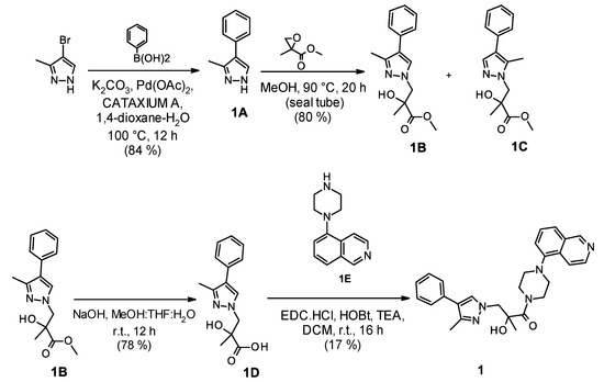 Compound (1) was synthesized starting from 3-bromo-4-methyl pyrazole. Coupling of phenyl boronic acid with the pyrazole derivative in the presence of Pd catalyst yielded phenyl pyrazole (1A) in 84% yield. Thermal ring opening of the epoxide with phenyl-pyrazole afforded intermediates (1B) (minor isomer) and (1C) (major isomer) in 80% overall yield. Subsequent hydrolysis of the ester (1B) gave the acid (1D), and an amide coupling with the piperazine substituted isoquinoline (1E) resulted in the desired final product (1). Other derivatives of these series were synthesized following this general procedure (Scheme 1). All compounds of this series contain a chiral center and were profiled as racemic mixtures.
