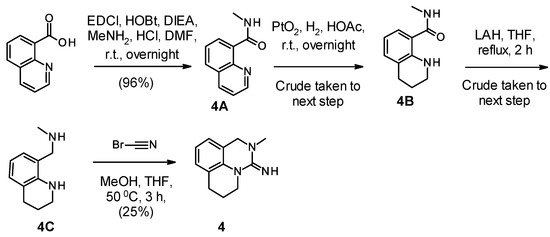 Synthesis of compound (4) has been accomplished starting from quinoline-8-carboxylic acid. After formation of the corresponding N-methyl-carboxamide (4A), the pyridine ring of the quinoline system was reduced over PtO2 to give (4B), followed by reduction of the carboxamide with LAH to afford (4C). Treatment of the resulting diamine (4C) with BrCN results in a ring closure to the desired product (4) (Scheme 4).