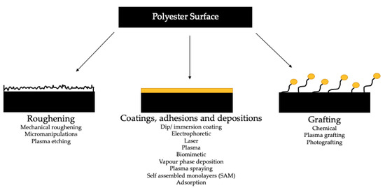 Controlling biocompatibility is an ongoing challenge with biomaterials, as synthetic and naturally occurring polymers quite often do not have the surface properties, which are required for specific applications [91]. Generally, surface enhancements are made with certain objectives. When considering polyester surface enhancements, they are challenging to modify due to their ease of degradation with chain scission, solvent sensitivity, and low heat stability [92,93]. Surface enhancements are typically conducted to increase or reduce [90]: