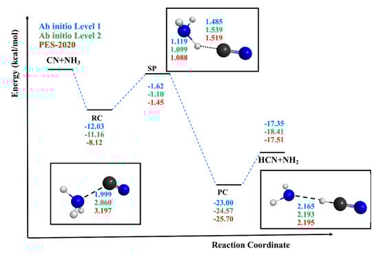 Classical energy diagram of the stationary points for the CN + NH3 reaction. First entry, Level 1, CCSD(T)-F12a/aug-cc-pVDZ; second entry, Level 2, CCSD(T)/6-311++G(d,p); and third entry, potential energy surface (PES)-2020. As insets, we include the optimized geometries of the reactant complex, RC2, saddle point and product complex. Energy in kcal mol−1 and distances in Å. Blue ball: N atom; gray ball: H atom; black ball: C atom.